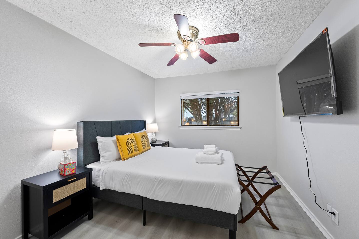 Guest can park one vehicle inside the garage and another one on the driveway. Street parking is available too. The property is on the corner of two streets, please take extra caution when backing up a vehicle onto the street.