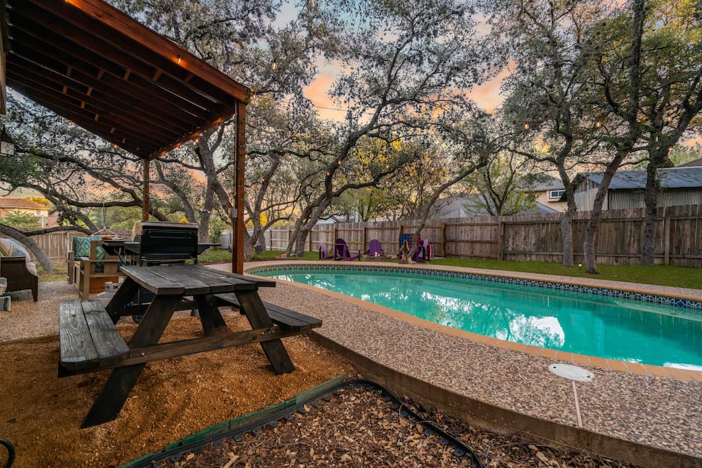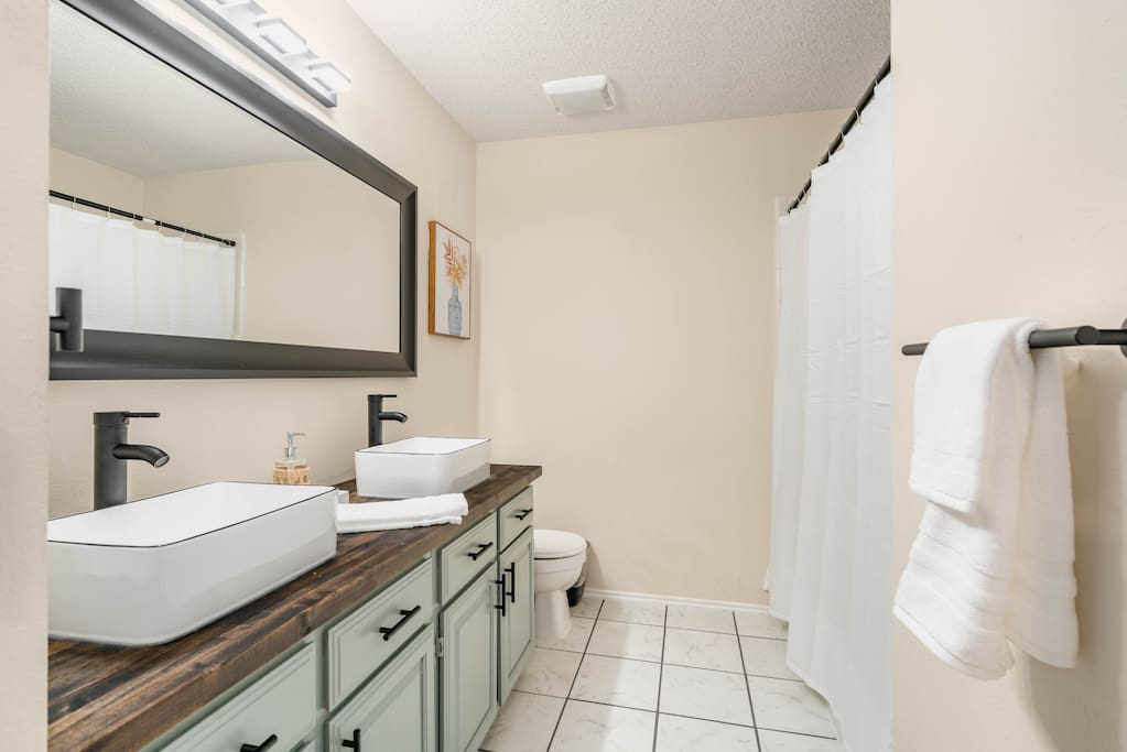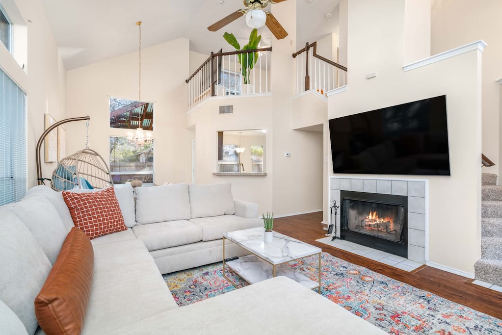 Welcome to Oaks Resort! The 3-bedroom villa with a large backyard of trees and amenities is perfect for a family gathering or short escape. Inside the villa, you will love the cozy rooms with comfy beds (1 king, 1 queen, 2 full, 1 futon). Enjoy your time with air hocky, foosball, board games, and 70-in TVs. In the backyard, you have full access to the pool, firepit, BBQ and life-size games. We love to accomodate families, and have pack & play and high chair ready. The pool is not heated.
